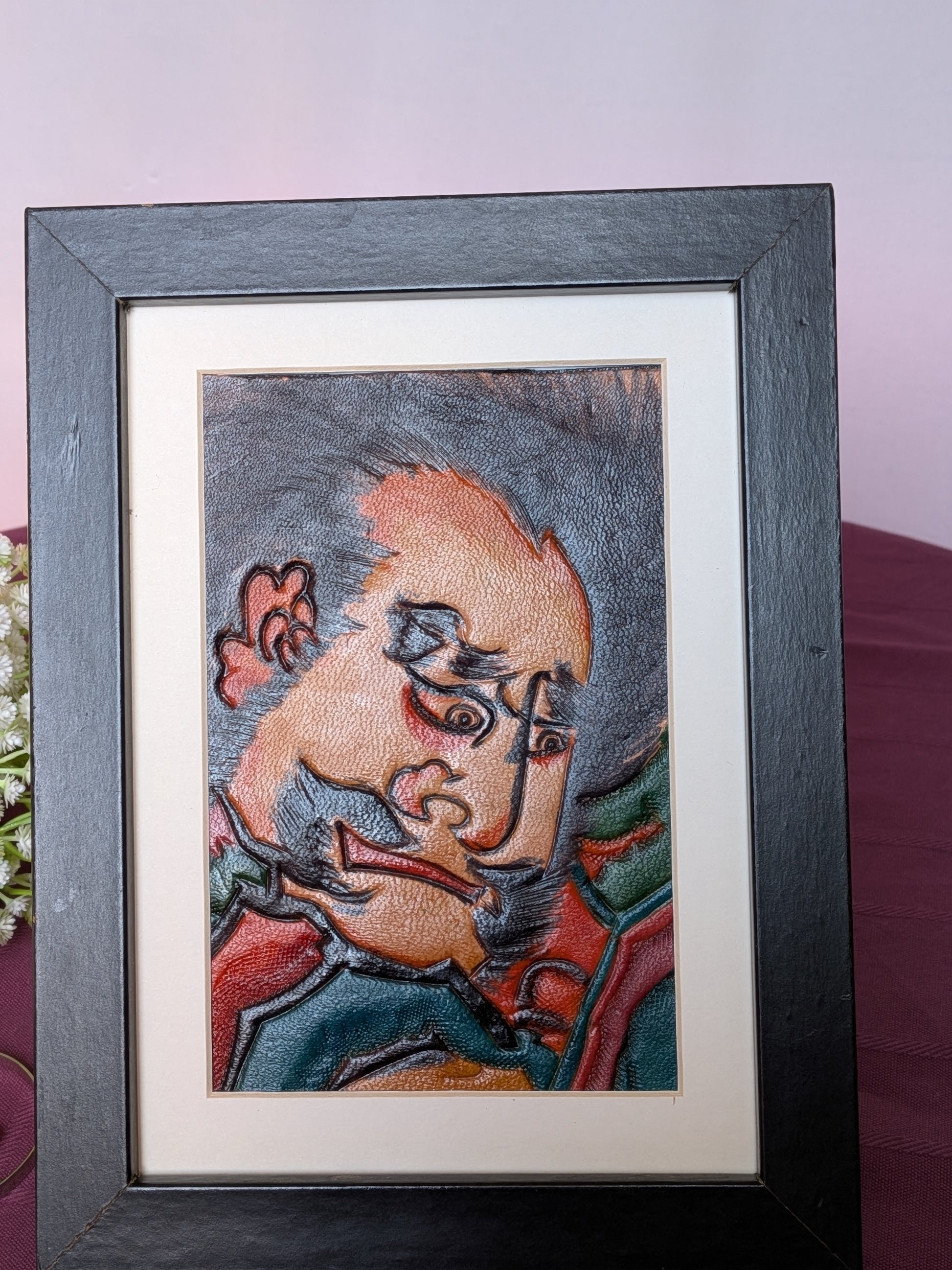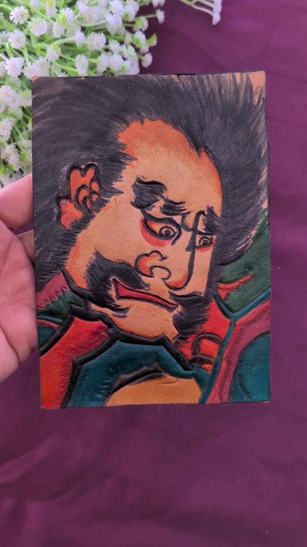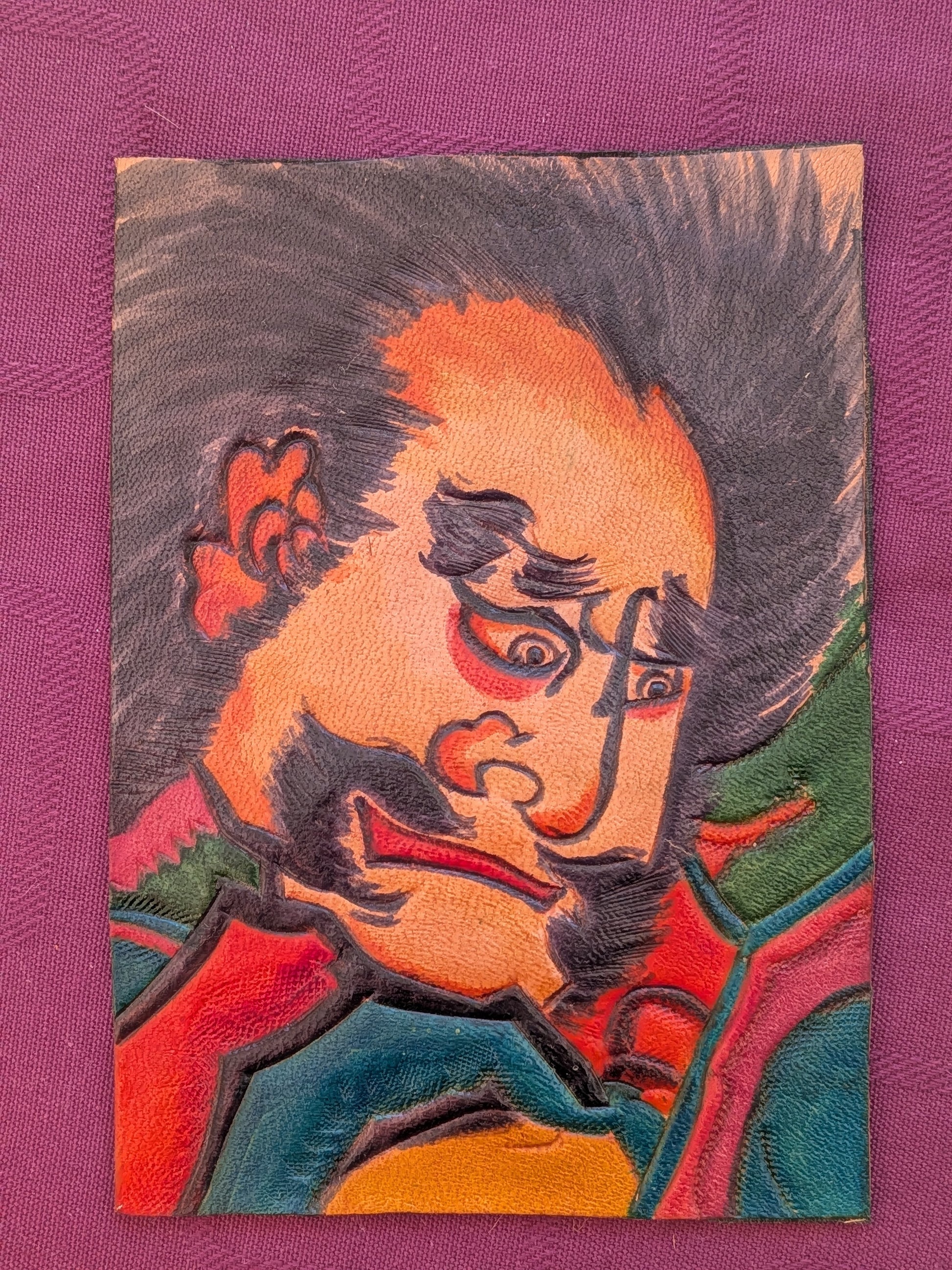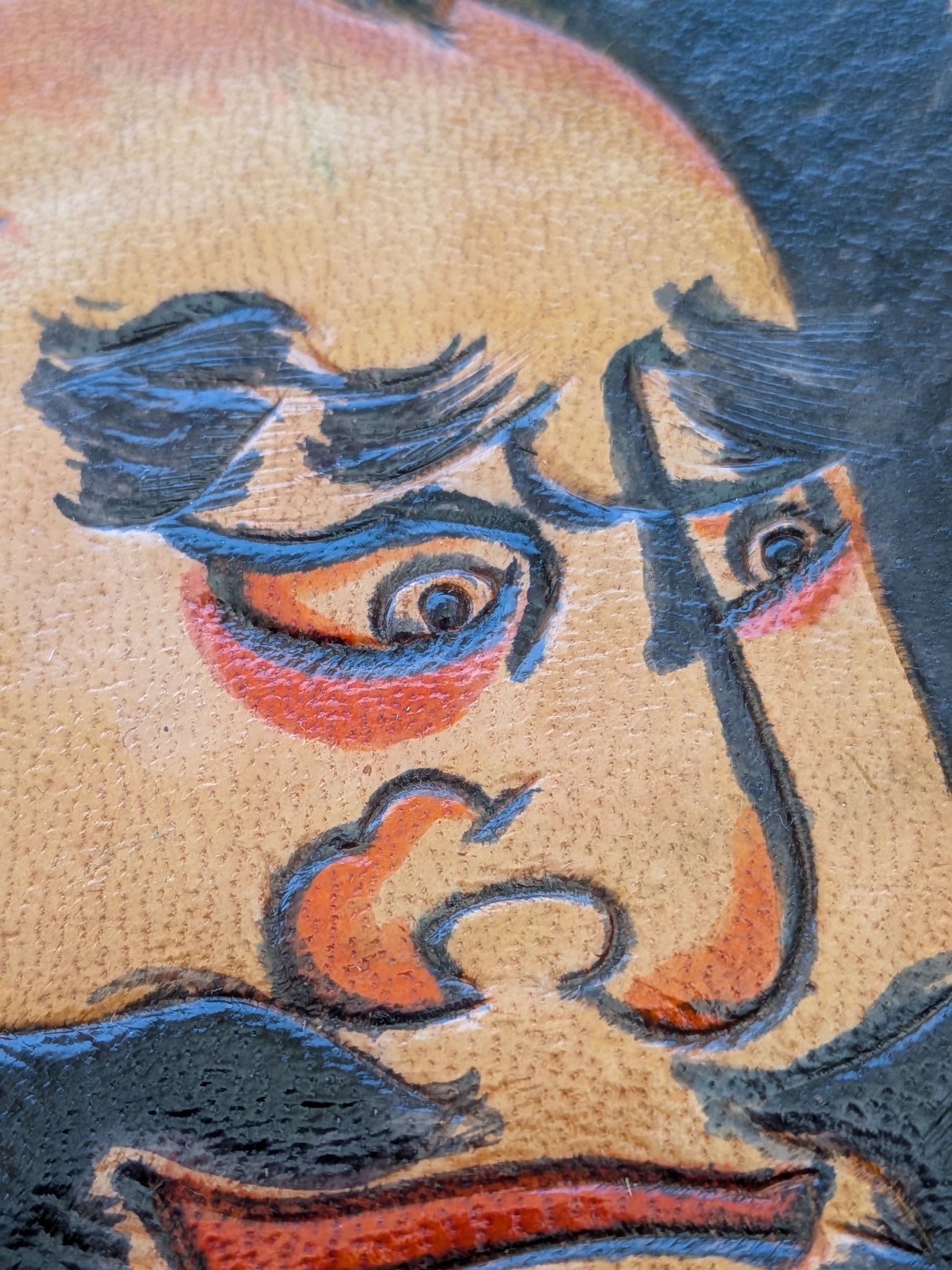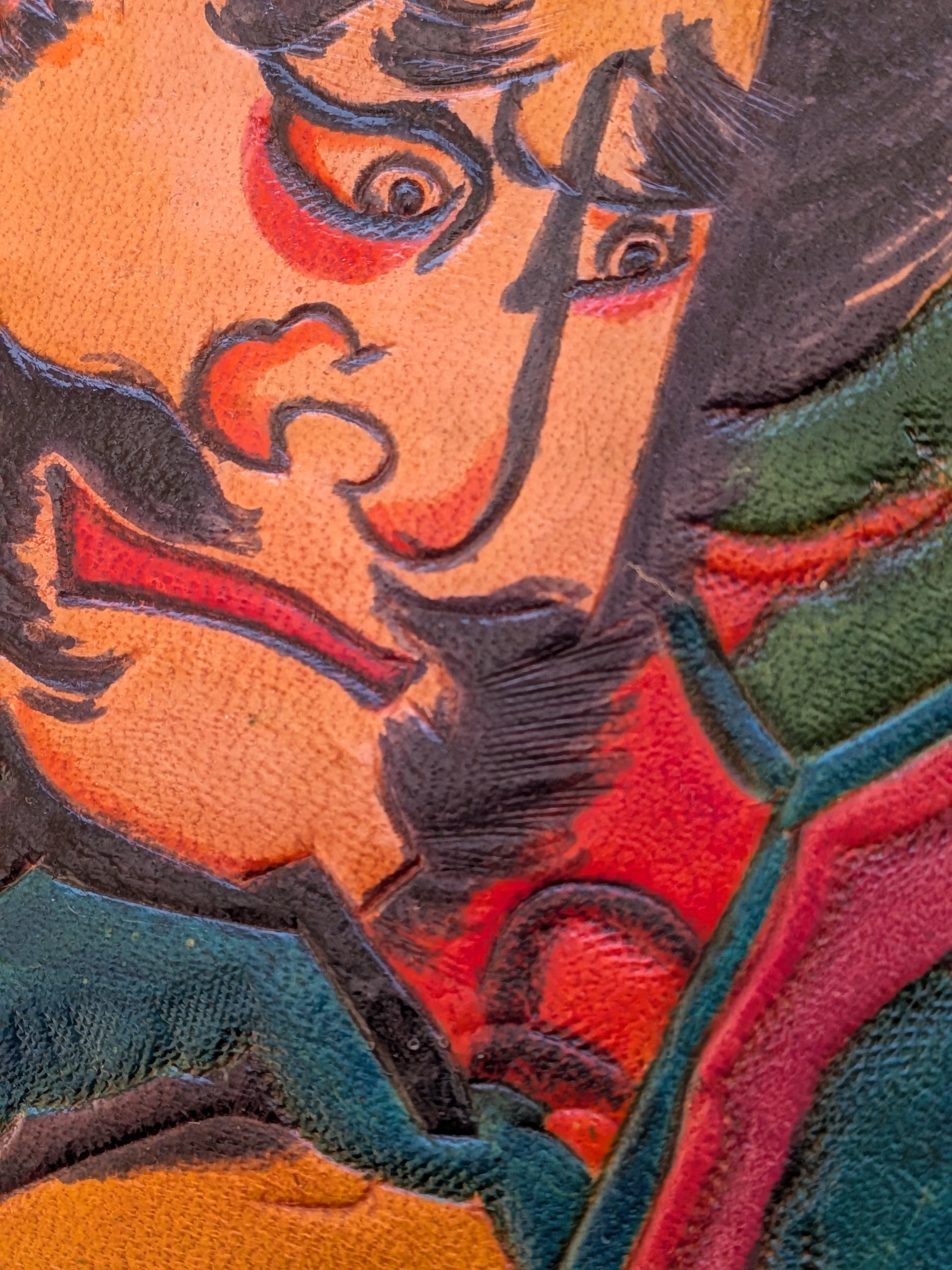 Contrairement aux cerfs-volants classiques en papier, cette pièce est réalisée en cuir repoussé et ciselé, ce qui lui donne un relief saisissant et une présence physique beaucoup plus forte. Le travail sur les traits noirs et le relief du visage est d'une grande finesse.
