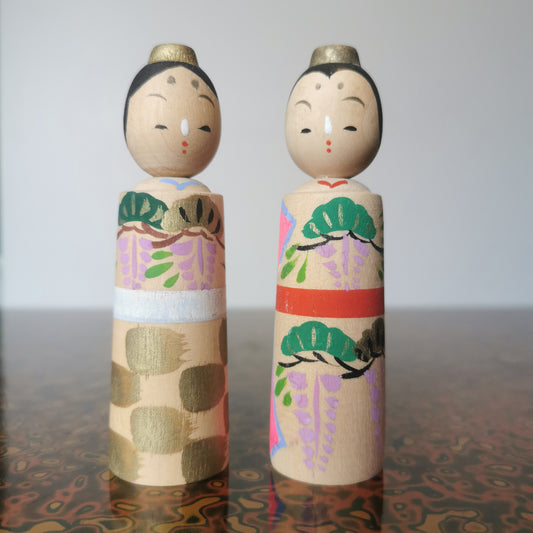 Poupée Kokeshi miniature rétro Showa en couple. Poupées Hina Matsuri